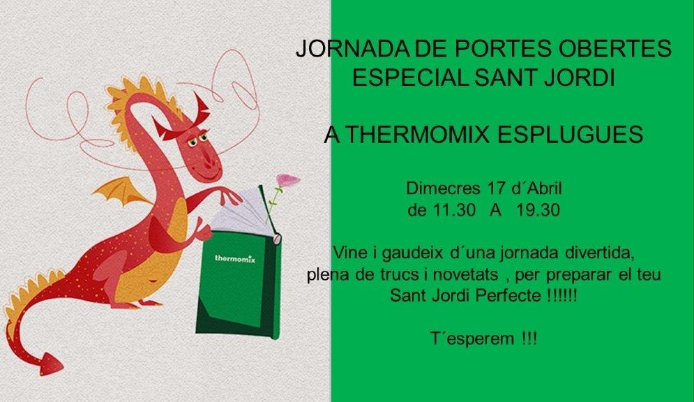 El próximo miércoles, día 17 de abril de 11:30 a 19:30, en la delegación de Thermomix® de Esplugues, celebraremos el Día de Sant Jordi. Al caer justo después de semana santa hemos querido hacerlo con tiempo para que podáis preparar la recetas y pasar un Sant Jordi perfecto.