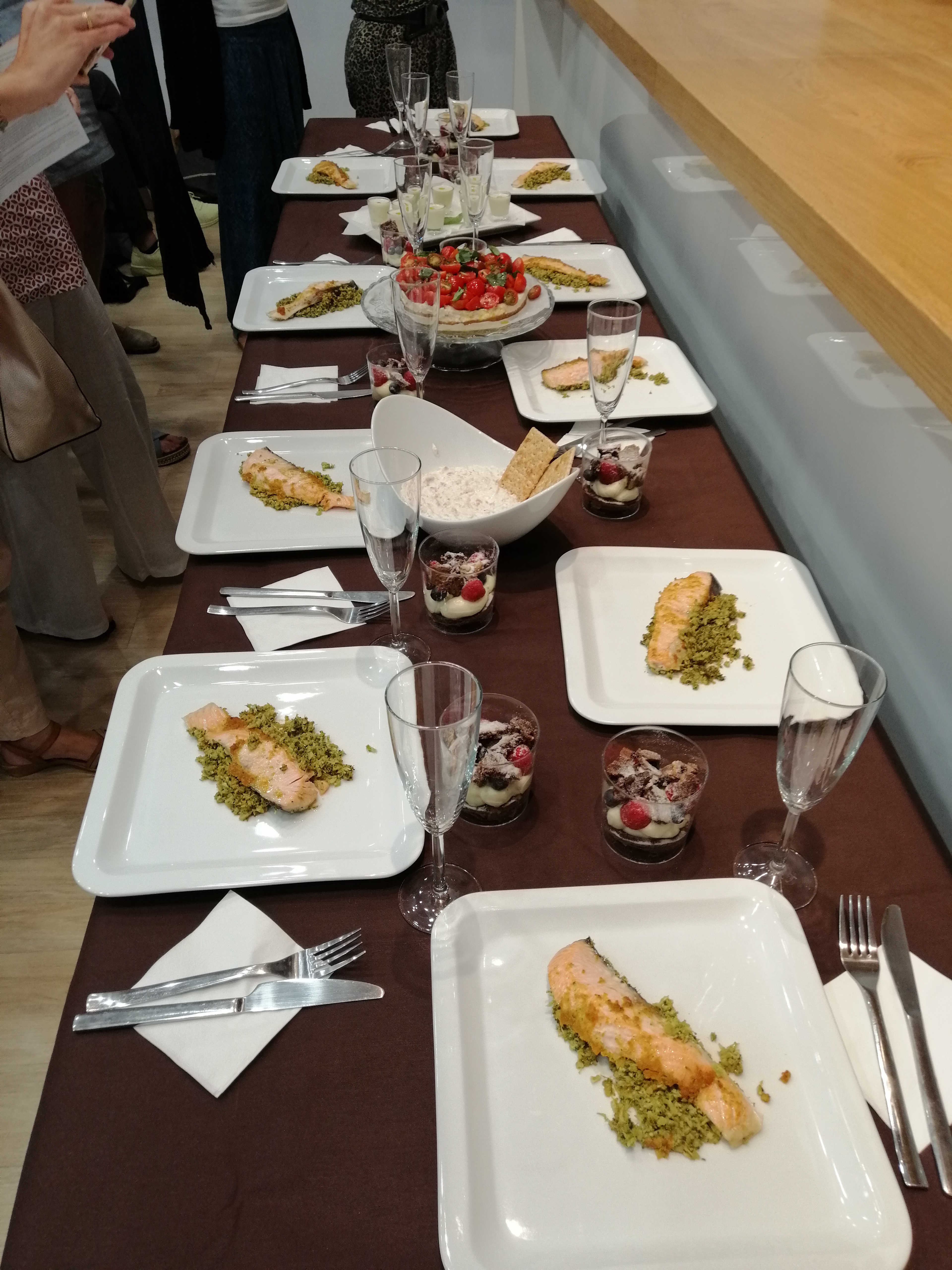 Sirva el Dip cremoso de jamón y el Ajoblanco de avellana con compota de manzana de aperitivo. La Tarta de tres quesos y tomates cherry de entrante. El Salmón a la naranja con cuscús de brócoli de plato principal y el Brownie con crema de mascarpone y frutos rojos de postre.