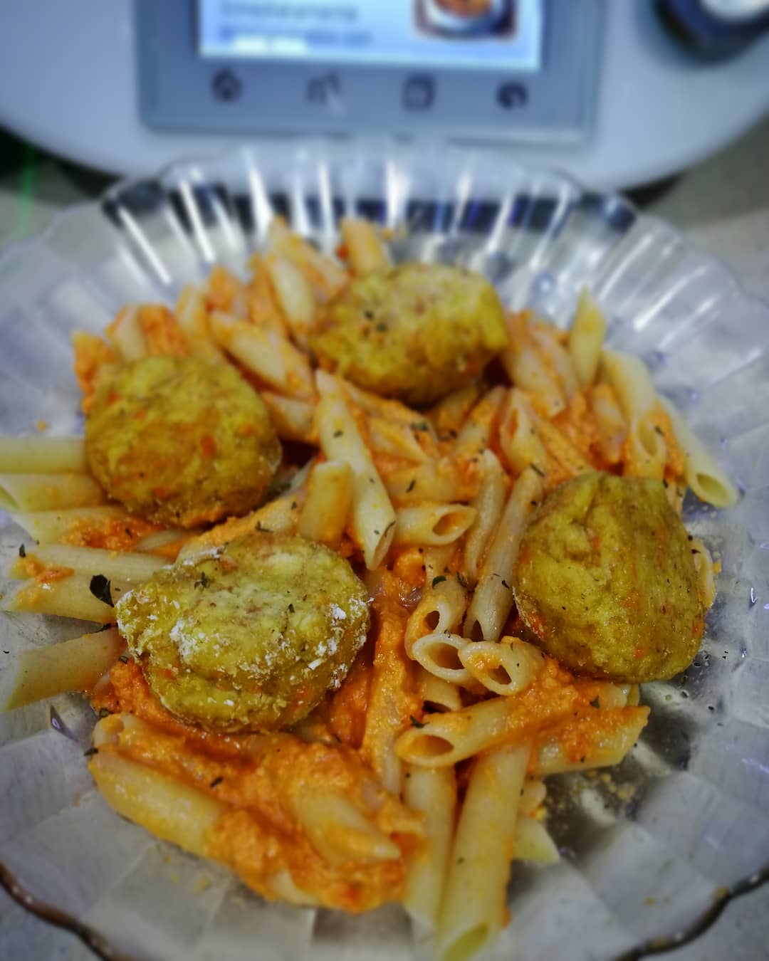 10. Añadir la pasta a traves de la abertura y programar El tiempo que indique el paquete de la pasta/100º/giro inverso/vel 1. Verte la pasta en el recipiente varoma y escurrirla. Mezclar con la salsa y las albóndigas y servir inmediatamente espolvoreados con las hojas de albahaca.