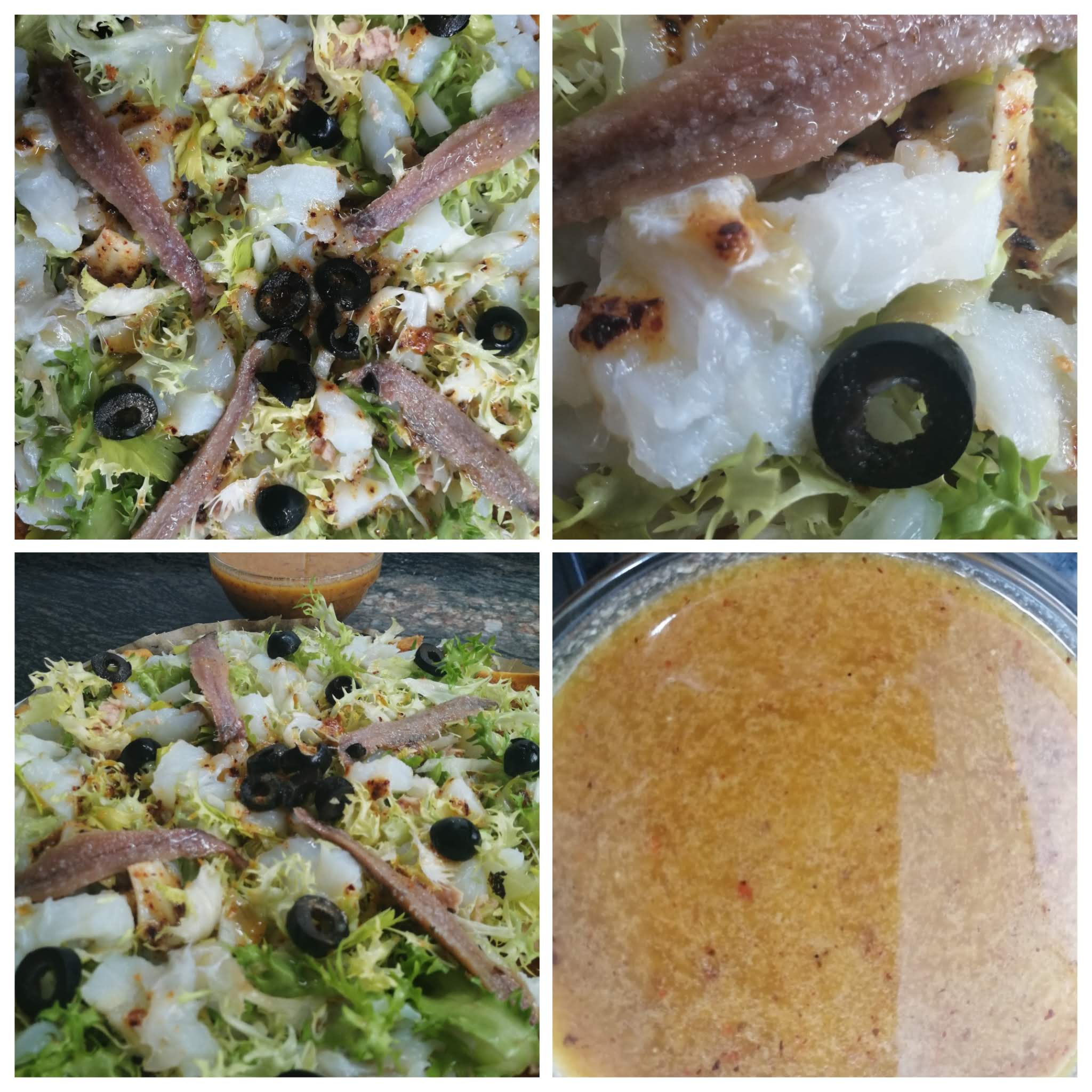 Coloque en la masa de pizza las hojas de escarola bien limpias, la cebolleta y el apio, las aceitunas, el atún desmenuzado, el bacalao y las anchoas. Riegue con la salsa reservada y sirva.