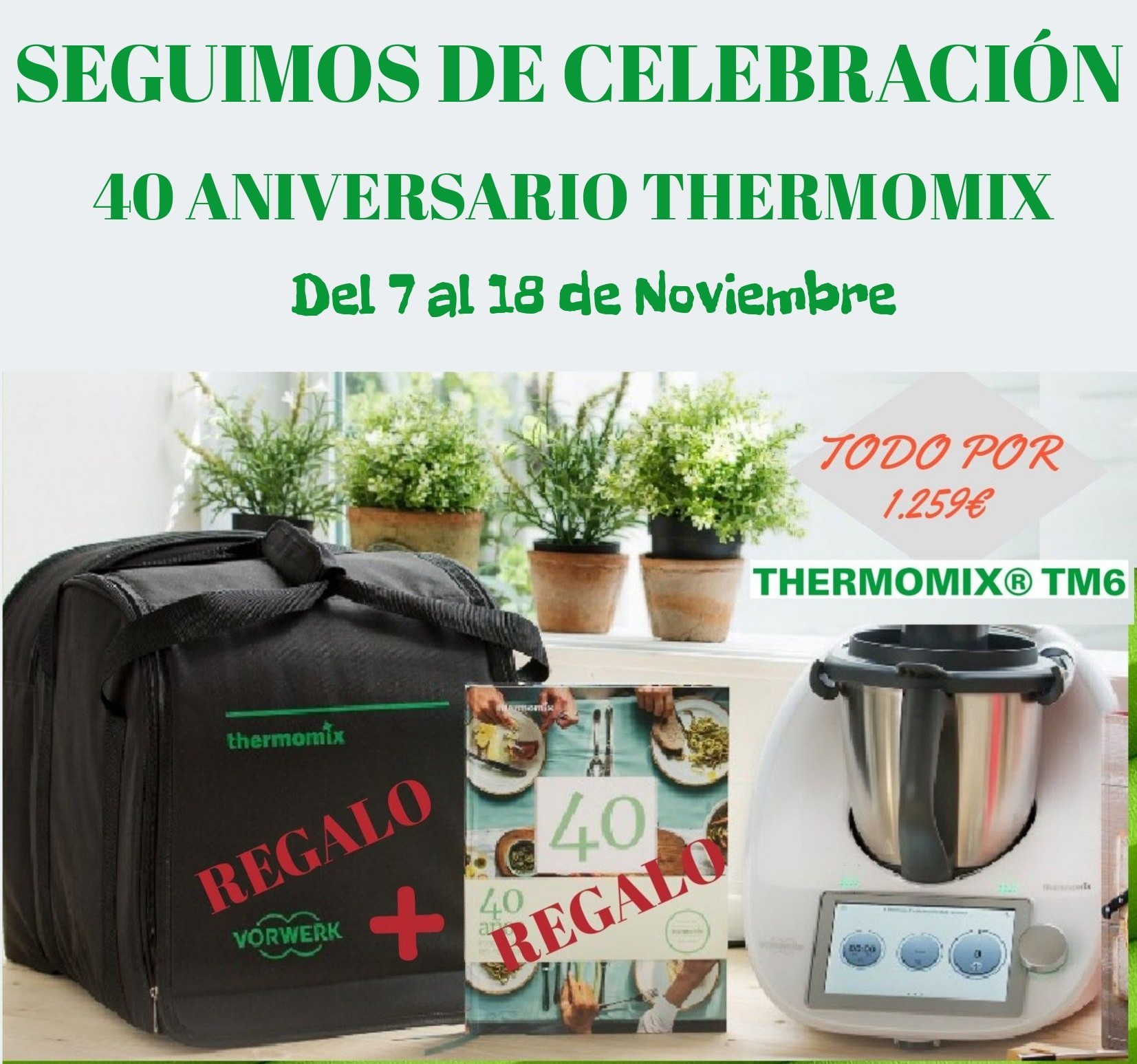 Thermomix regala a todos los que queráis el nuevo TM6: una bolsa de transporte para poder llevarlo donde quieras de una forma muy cómoda. Además, también de regalo, el libro del 40 aniversario donde encontrareis las 100 recetas más destacadas de estos años, todas actualizadas para cocinar con el último modelo y con consejos para obtener los mejores resultados