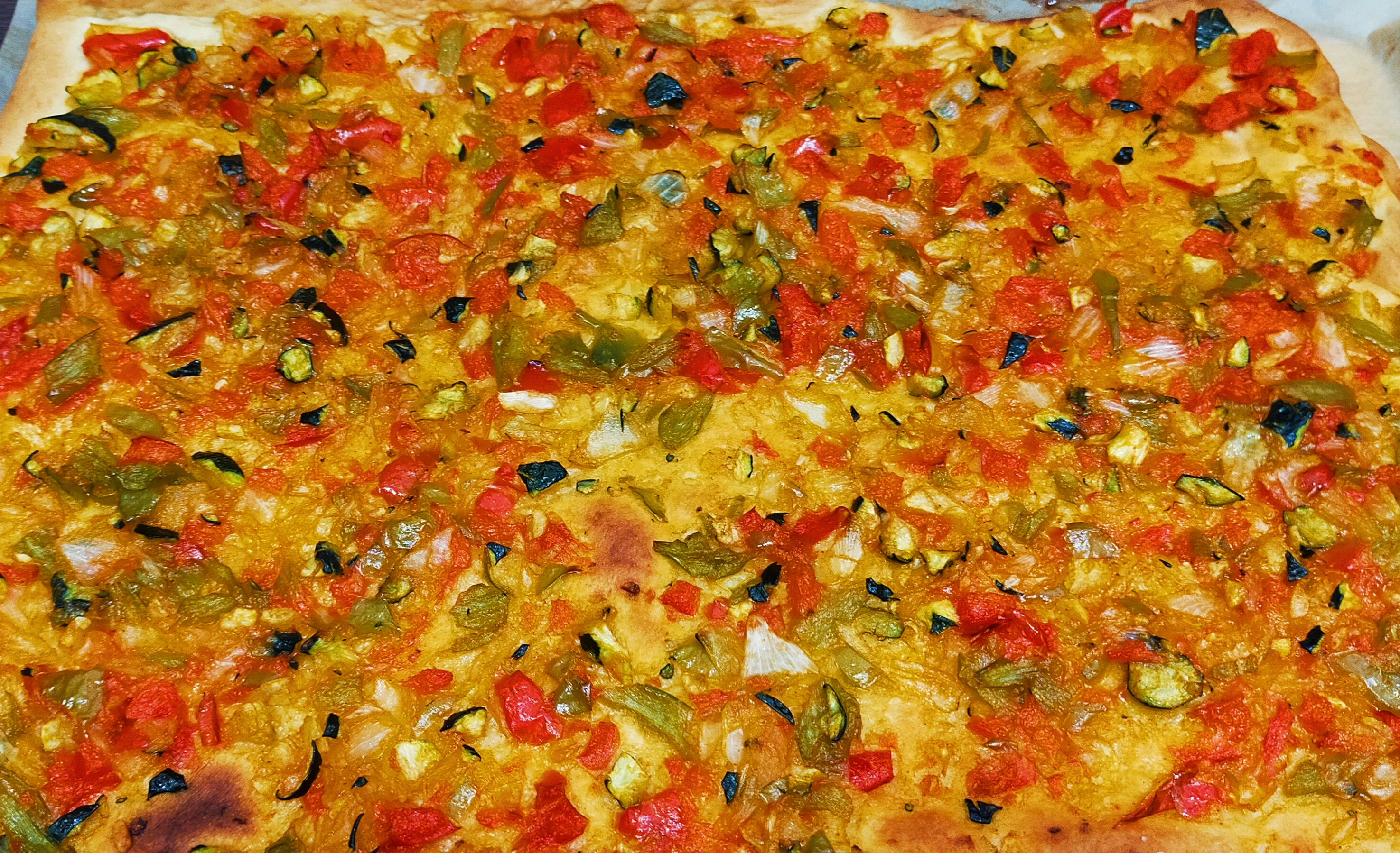 Es una coca que podemos preparar con antelación con las verduras que tengamos en la nevera y que se puede comer tanto fría como caliente.